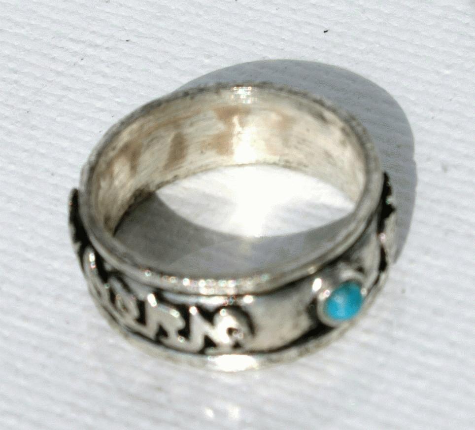 Anillos de metal con letras orientales y piedras turquesas