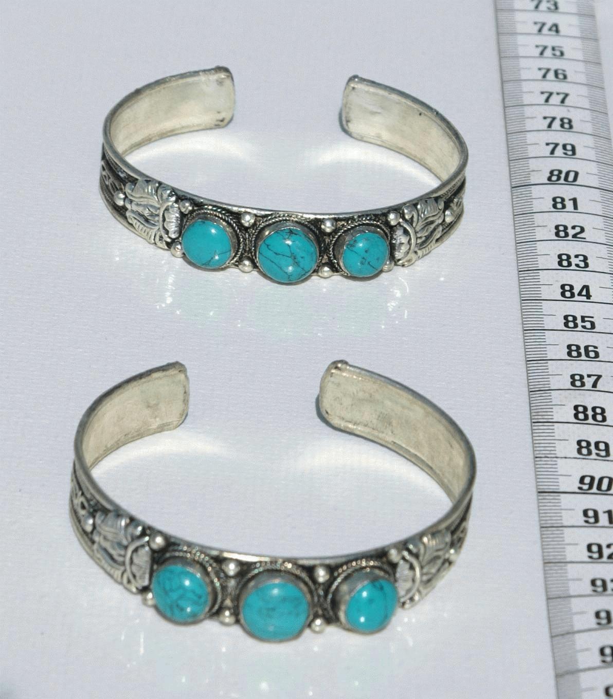 Pulseras de metal y tres piedras turquesas